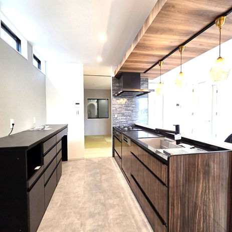 キッチンはブラックで統一し、デザイン性と機能性を兼ね備えた上質な仕上がりです。